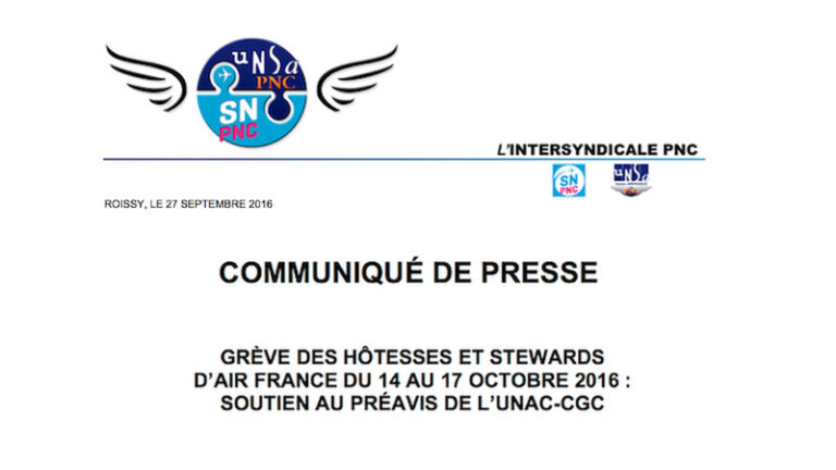 Grève des hôtesses et stewards d’Air France du 14 au 17 octobre 2016 : SOUTIEN AU PRÉAVIS DE L’UNAC-CGC ROISSY, LE 27 SEPTEMBRE 2016, Air France affiche la reprise d’un dialogue social dans l’entreprise suite à la grève PNC…